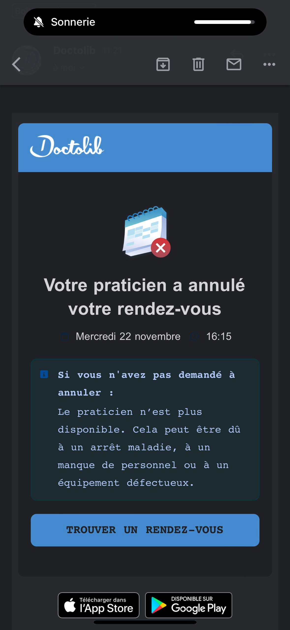 Annulation à la dernière minute via doctolib, Pas d appel, de programmation d un autre rendez-vous C est sympa après 2 mois d attentes